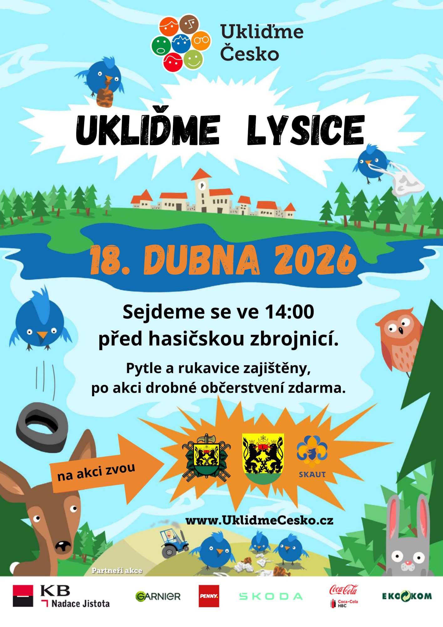 SDH Lysice, Skauti Lysice a Městys Lysice zvou v sobotu 18. dubna na úklid Lysic a okolí Ukliďme Česko, ukliďme Lysice. Sraz je ve 14:00 hodin před hasičskou zbrojnicí. Pytle a rukavice zajištěny, po akci drobné občerstvení zdarma.